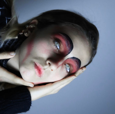 I edited her eyes to be milky as if she has cataracts to show a distorted perception of reality which is fitting with the Tim Burton-esque styling. Tim Burton's films often leave you questioning the world around you and your sense of reality. I used studio lighting to create harsh light and shadows and I also like the control that they give you over the lighting. I also took the photo into Procreate to fix any patchiness of the makeup and add texture to the mouth. I think this was important in giving the model less of a relatability as they are unrealistically perfect.